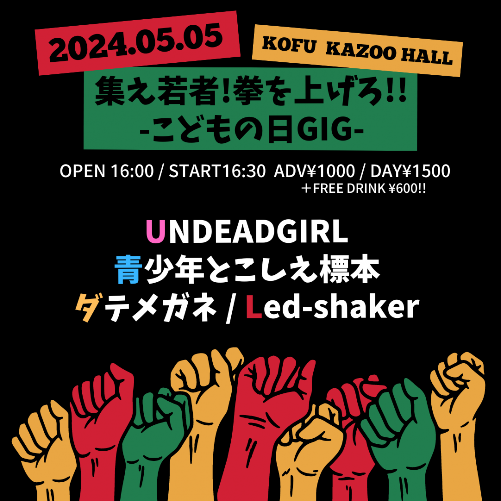 KAZOO HALL presents集え若者!拳を上げろ!! -こどもの日GIG-OPEN 16:00 / START 16:30 adv ¥1000(D別) / day ¥1500(D別) [出演] [チケット取扱い] |