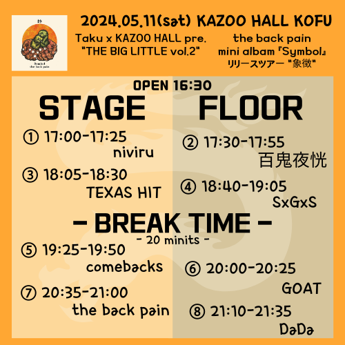 Taku x KAZOO HALL presentsTHE BIG LITTLE vol.2-the back pain mini albam 『Symbol』 リリースツアー "象徴"-OPEN 16:30 / START 17:00 adv ¥2400(D別) / day ¥2900(D別) [出演] [チケット取扱い] |
