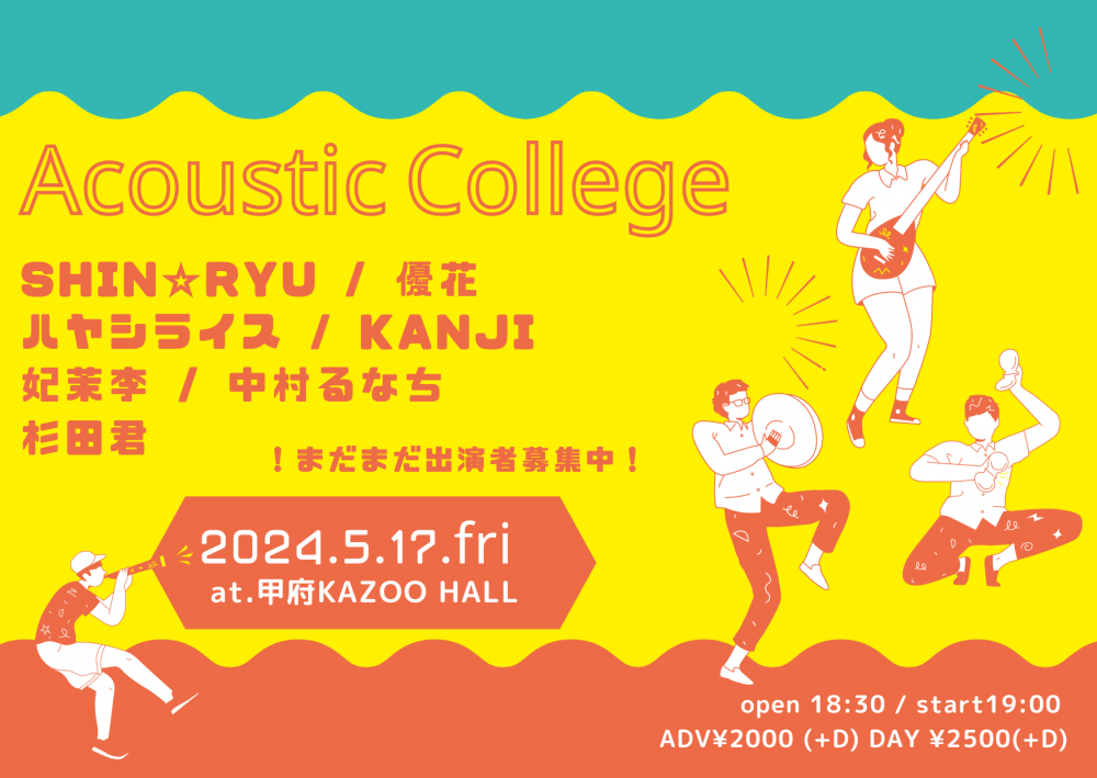 KAZOO HALL presentsAcoustic CollegeOPEN 18:30 / START 19:00 adv ¥2000(D別) / day ¥2000(D別) [出演] [チケット取扱い] |