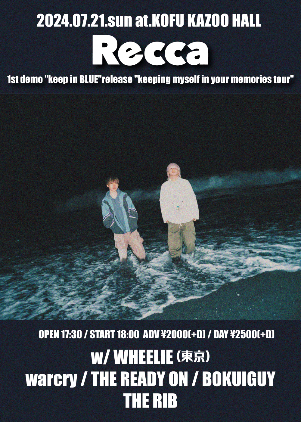 KAZOO HALL presentsRecca 1st demo"keep in BLUE"release TOUR -keeping myself in your memories tour-OPEN 17:30 / START 18:00 adv ¥2000(D別) / day ¥2500(D別) [出演] [チケット取扱い] |
