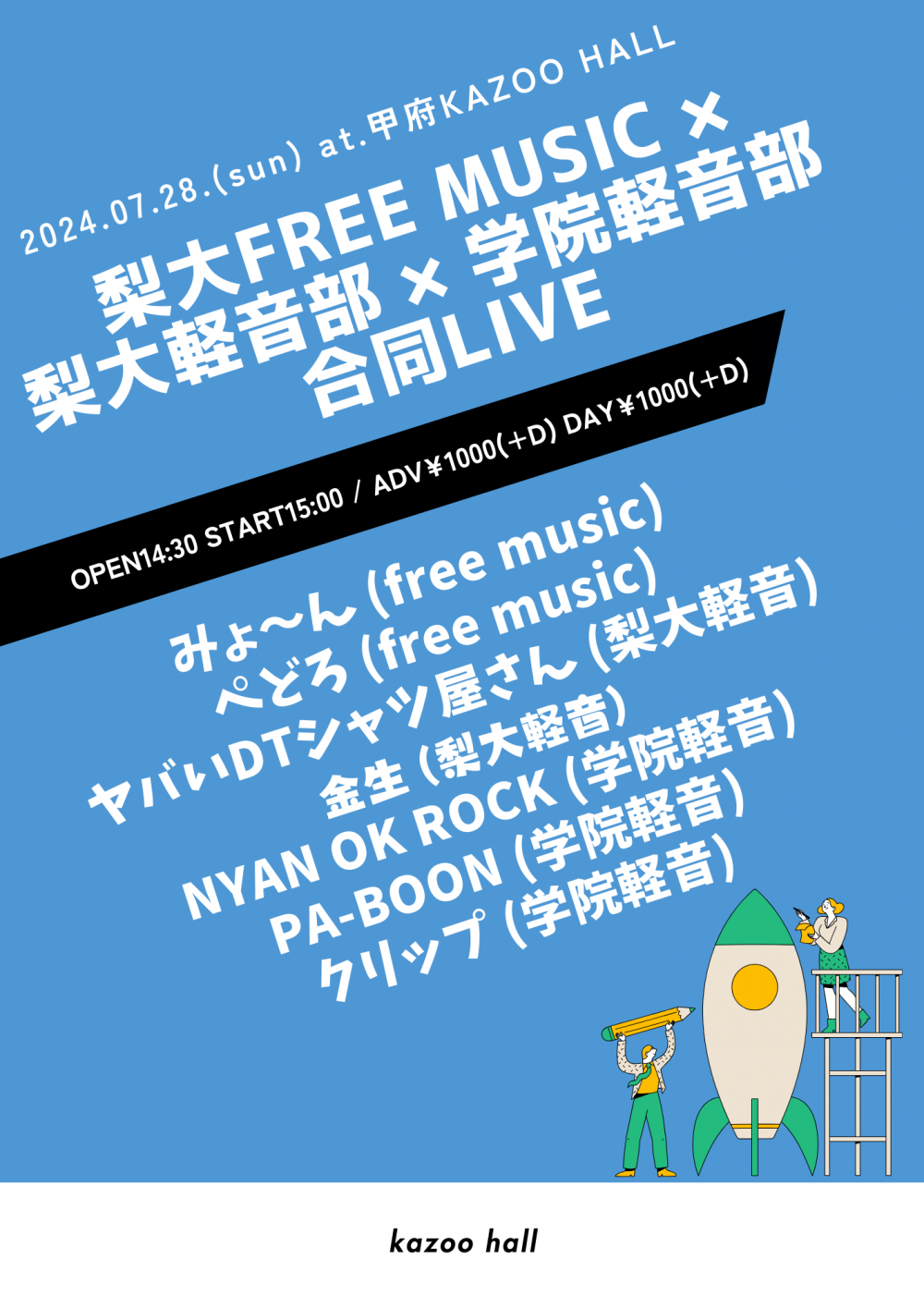 KAZOO HALL presents梨大free music x 梨大軽音部 x 学院軽音部 合同LIVEOPEN 15:30 / START 16:00 adv ¥1000(D別) / day ¥1500(D別) [出演] [チケット取扱い] |