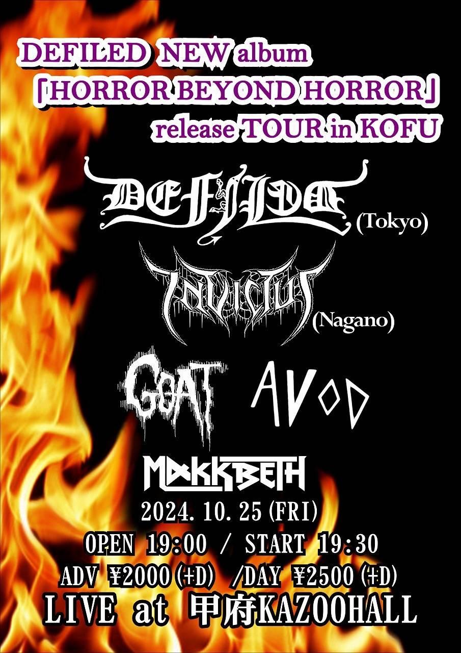 KAZOO HALL 23rd AnniversaryAVOD presents Defiled NEW album「Horror beyond Horror」 release TOUR in KOFU」OPEN 19:00 / START 19:30 adv ¥2000(D別) / day ¥2500(D別) [出演] [チケット取扱い] |