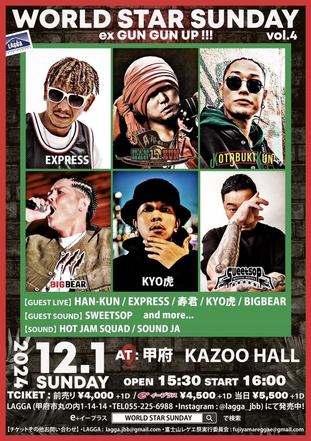 なしやまサマーフェスティバル実行委員会/富士山レゲエ祭実行委員会 presentsWORLD STAR SUNDAY vol.4 ex GUNGUN UP!!!OPEN 15:30 / START 16:00 adv ¥4000(D別)/e+¥4500(D別) / day ¥5500(D別) [出演] [チケット取扱い] |