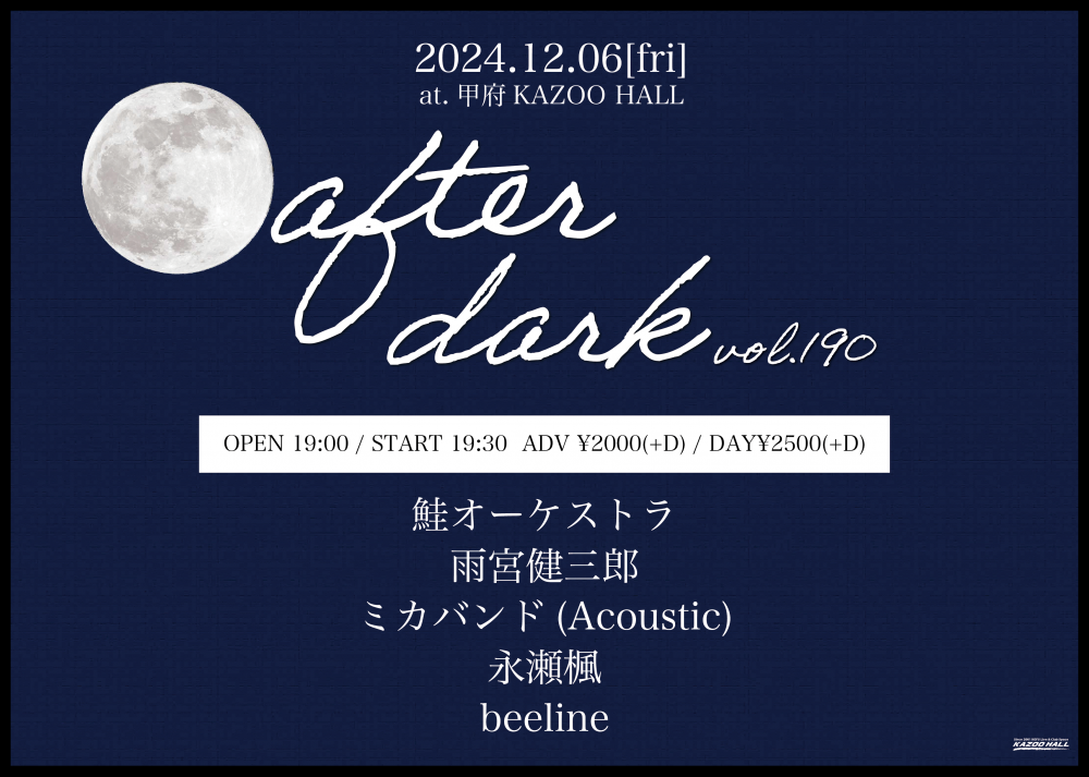 KAZOO HALL presentsafter dark vol.190OPEN 19:00 / START 19:30 adv ¥2000(D別) / day ¥2500(D別) [出演] [チケット取扱い] |
