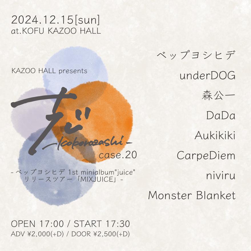 KAZOO HALL presents志-kokorozashi- case.20 -ベップヨシヒデ 1st minialbum"juice"リリースツアー「MIXJUICE」-OPEN 17:00 / START 17:30 adv ¥2000(D別) / day ¥2500(D別) [出演] [チケット取扱い] |