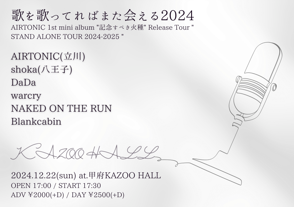 KAZOO HALL presents歌を歌ってればまた会える 2024 ~AIRTONIC 1st mini album "記念すべき火種" Release Tour " STAND ALONE TOUR 2024-2025 " ~OPEN 17:00 / START 17:30 adv ¥2000(D別) / day ¥2500(D別) [出演] [チケット取扱い] |
