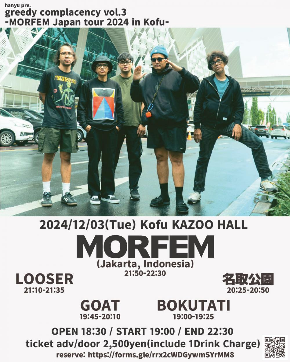 hanyu presentsgreedy complacency vol.3 -MORFEM Japan Tour 2024 in Kofu-OPEN 18:30 / START 19:00 adv ¥1900(D別) / day ¥1900(D別) [出演] [チケット取扱い] |