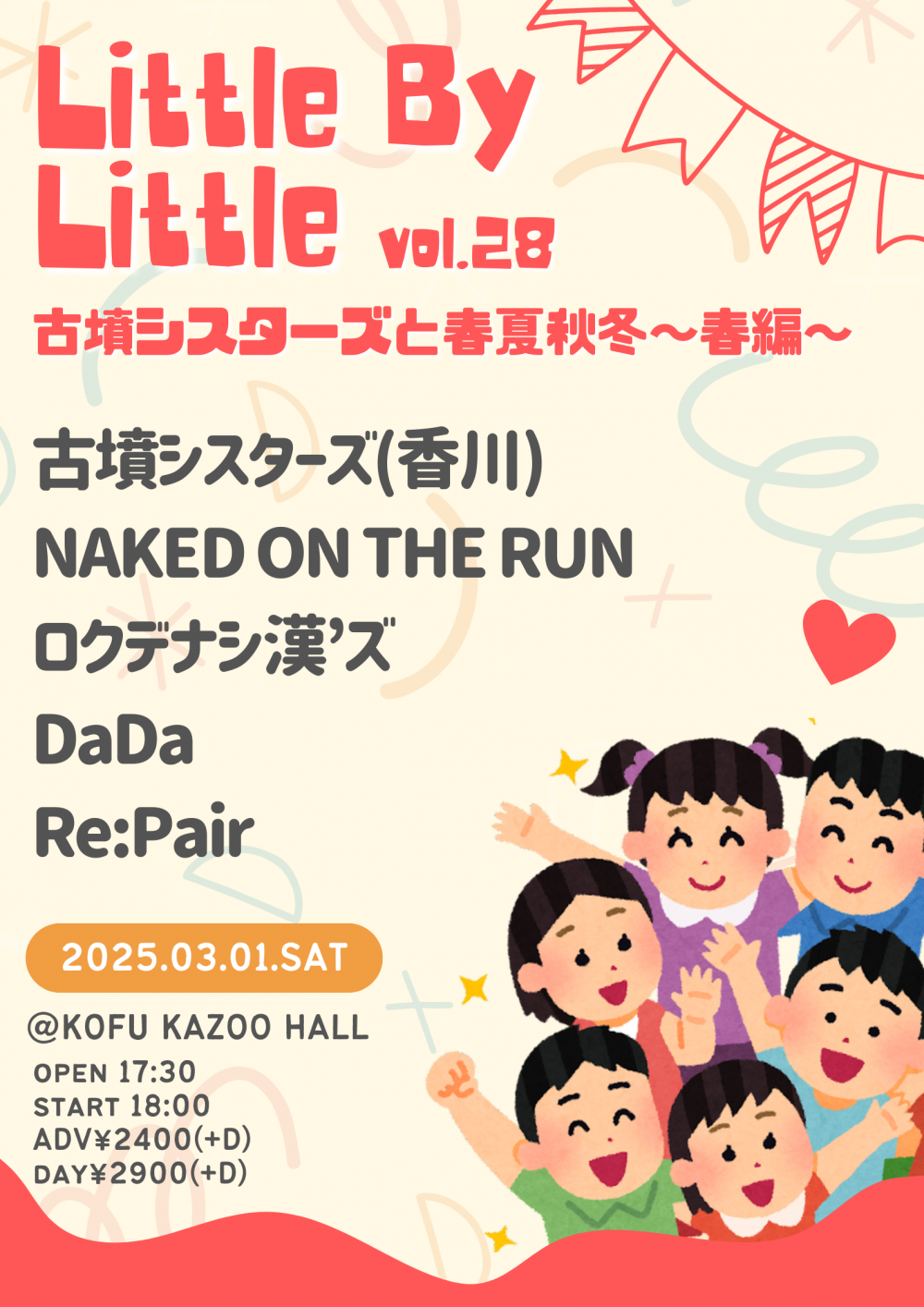 KAZOO HALL presentsLittle By Little vol.28 -古墳シスターズと春夏秋冬~春編~-OPEN 17:30 / START 18:00 adv ¥2400(D別) / day ¥2900(D別) [出演] [チケット取扱い] |
