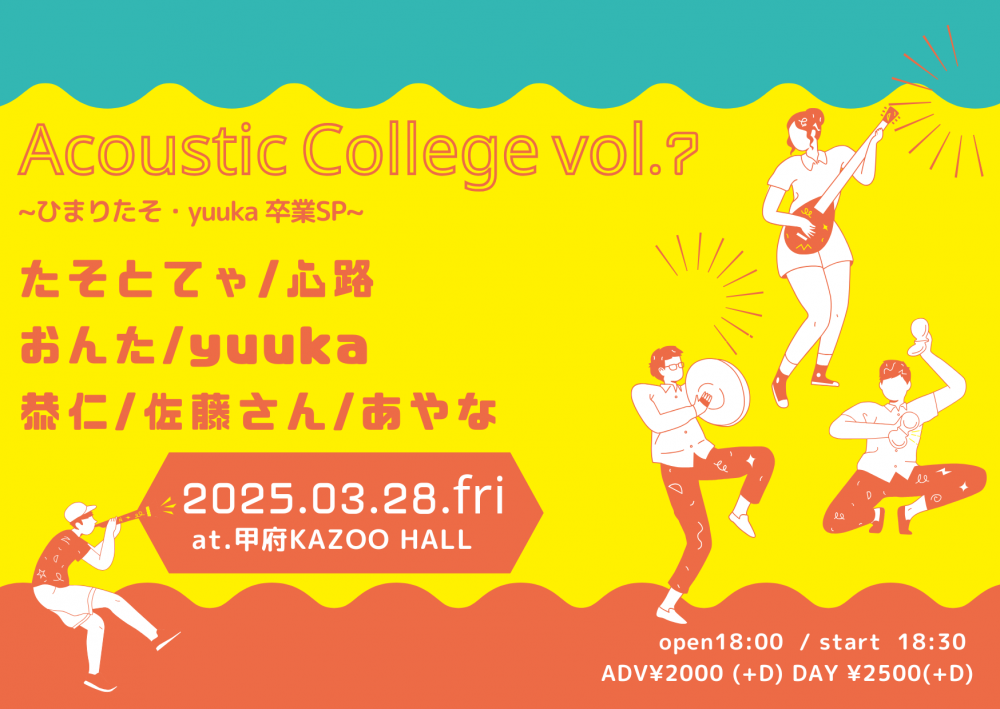 KAZOO HALL presentsAcoustic College vol.7 〜ひまりたそ・yuuka卒業SP〜OPEN 18:00 / START 18:30 adv ¥2000(D別) / day ¥2500(D別) [出演] [チケット取扱い] |