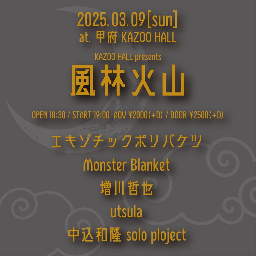 KAZOO HALL presents風林火山OPEN 18:30 / START 19:00 adv ¥2000(D別) / day ¥2500(D別) [出演] [チケット取扱い] |