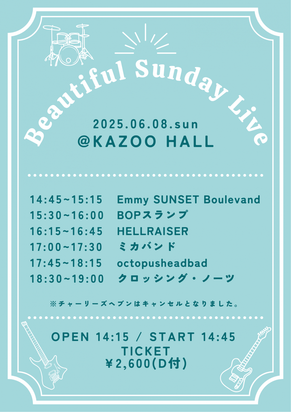 KAZOO HALL presentsBeautiful Sunday LiveOPEN 14:15 / START 14:45 adv ¥2000(D別) / day ¥2000(D別) [出演] [チケット取扱い] |