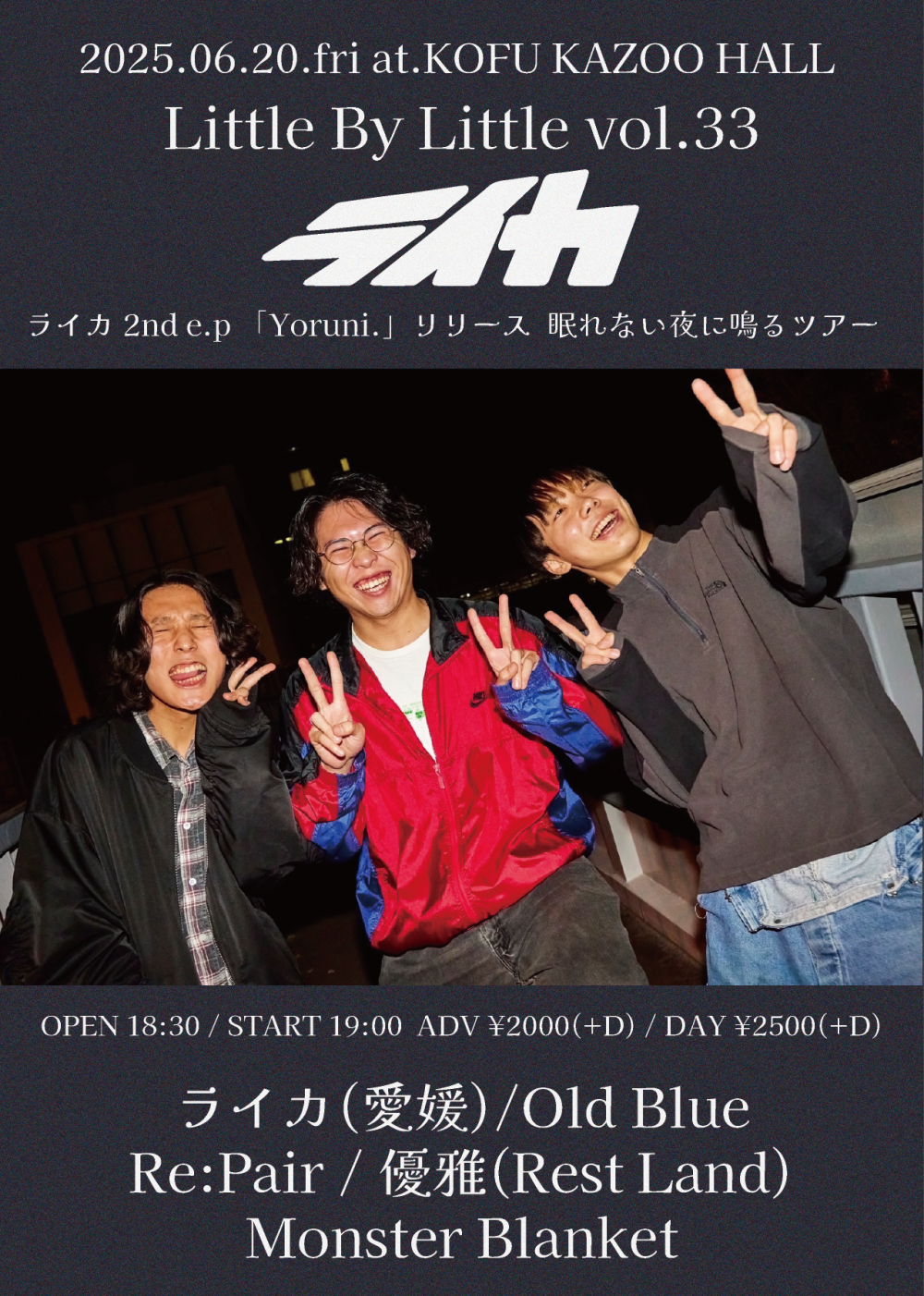 KAZOO HALL presentsLittle By Little vol.33〜ライカ 2nd e.p 「Yoruni.」リリース 眠れない夜に鳴るツアー〜OPEN 18:30 / START 19:00 adv ¥2000(D別) / day ¥2500(D別) [出演] [チケット取扱い] |