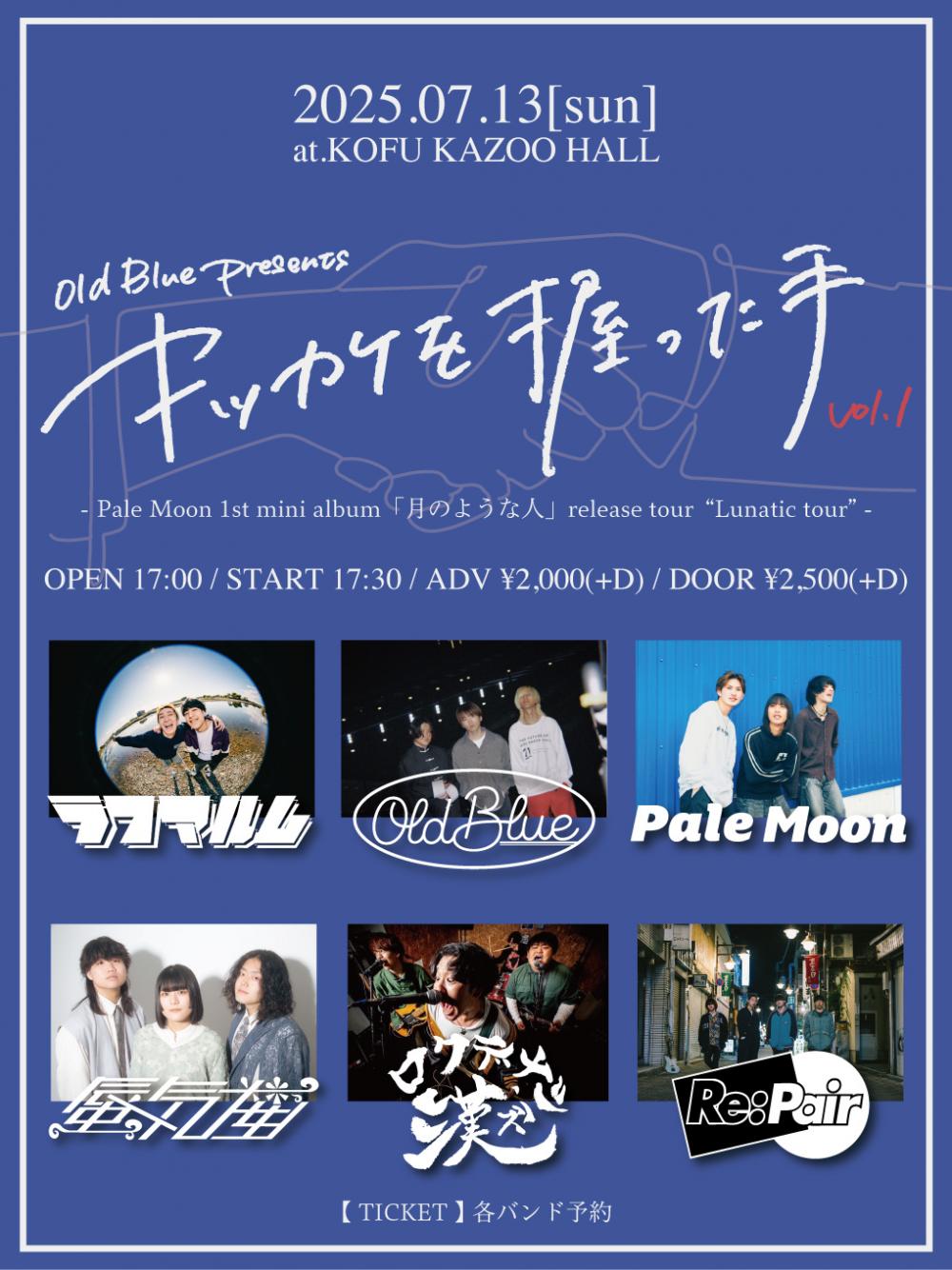 Old Blue presentsキッカケを握った手 vol.1 -Pale Moon 1st mini album「月のような人」release tour "Lunatic tour"-OPEN 17:00 / START 17:30 adv ¥2000(D別) / day ¥2500(D別) [出演] [チケット取扱い] |
