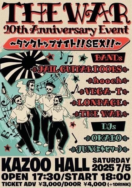 THE WAR presentsTHE WAR 20th Anniversary Event 〜タンクトップナイト!! SEX!!〜OPEN 17:30 / START 18:00 adv ¥3000(D別) / day ¥4000(D別) [出演] [チケット取扱い] |