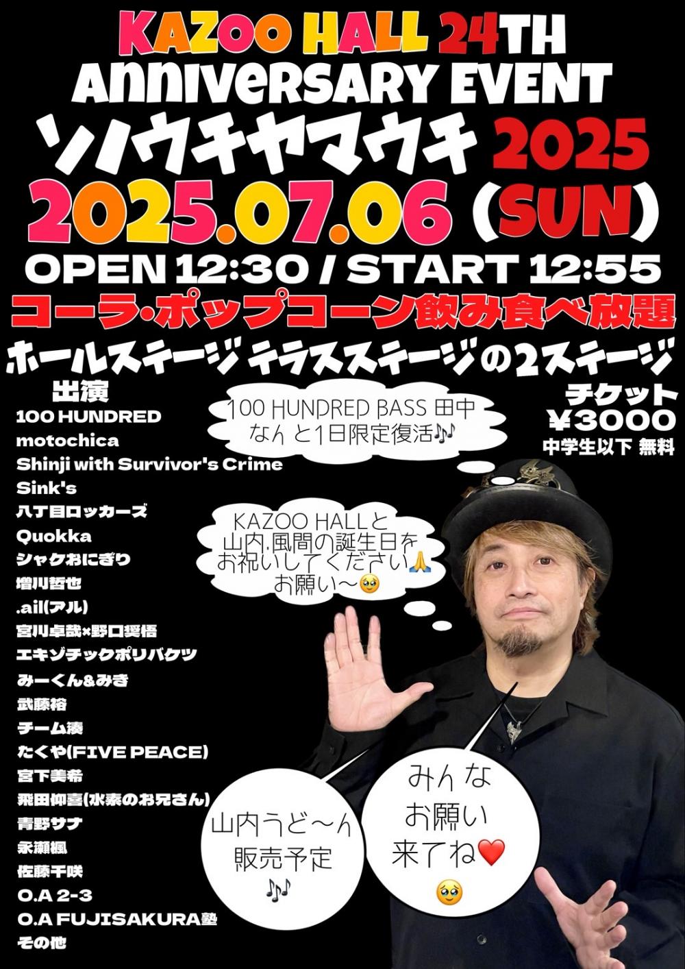 KAZOO HALL presentsKAZOO HALL 24TH Anniversary EVENT ソノウチヤマウチ 2025OPEN 12:30 / START 12:55 adv ¥3000(コーラ.ポップコーン飲み食べ放題) / day ¥3000(コーラ.ポップコーン飲み食べ放題) [出演] [チケット取扱い] |