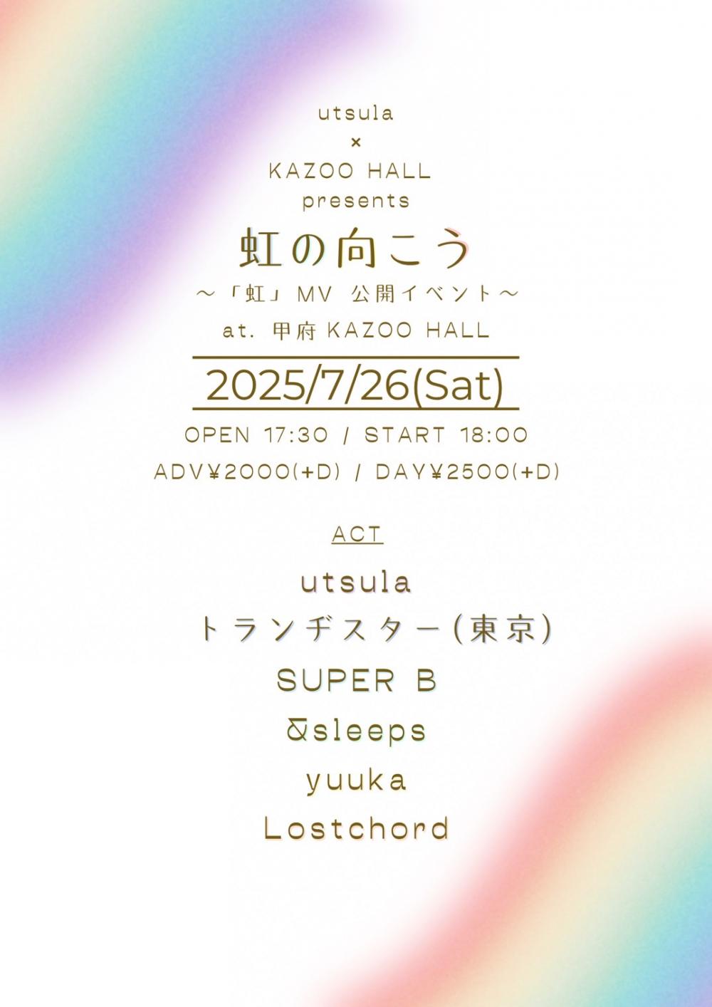 utsula x KAZOO HALL presents虹の向こう ~「虹」MV公開イベント~OPEN 17:30 / START 18:00 adv ¥2000(D別) / day ¥2500(D別) [出演] [チケット取扱い] |