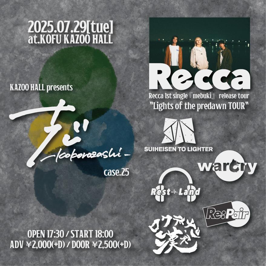 KAZOO HALL presents志-kokorozashi- case.25 -Recca 1st single 『mebuki』release tour "Lights of the predawn TOUR"-OPEN 17:30 / START 18:00 adv ¥2000(D別) / day ¥2500(D別) [出演] [チケット取扱い] |