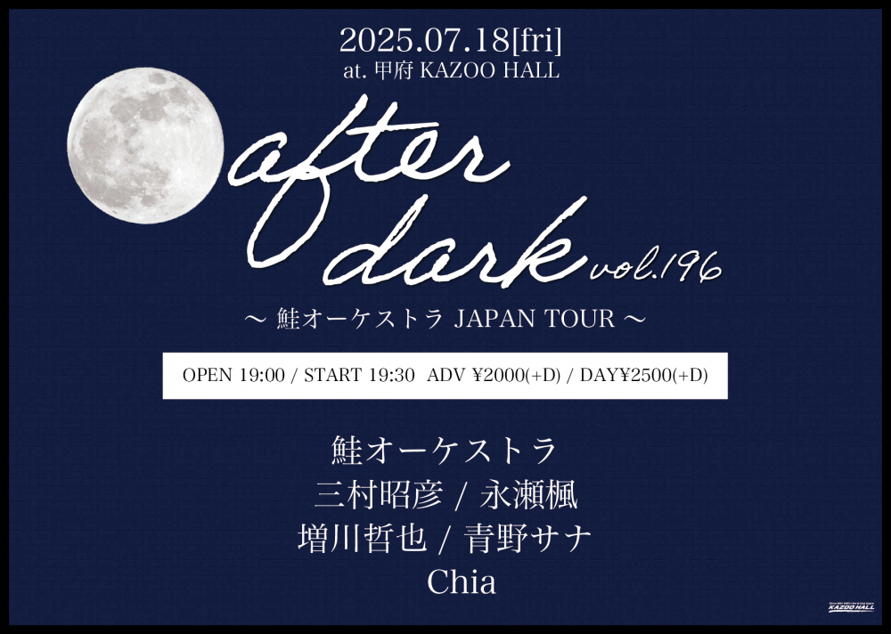 KAZOO HALL presentsafter dark vol.196OPEN 19:00 / START 19:30 adv ¥2000(D別) / day ¥2500(D別) [出演] [チケット取扱い] |