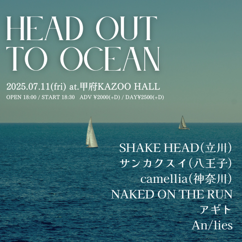 KAZOO HALL presentsHEAD OUT TO OCEANOPEN 18:00 / START 18:30 adv ¥2000(D別) / day ¥2500(D別) [出演] [チケット取扱い] |