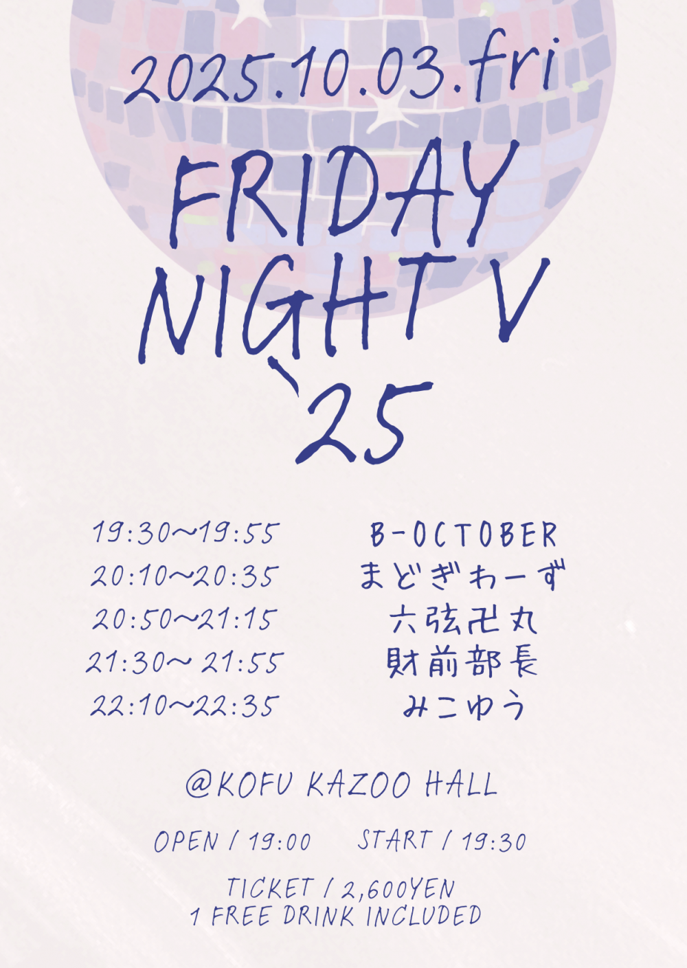 KAZOO HALL presentsFRIDAY NIGHT V '25OPEN 19:00 / START 19:30 adv ¥2600(D込) / day ¥2600(D込) [出演] [チケット取扱い] |