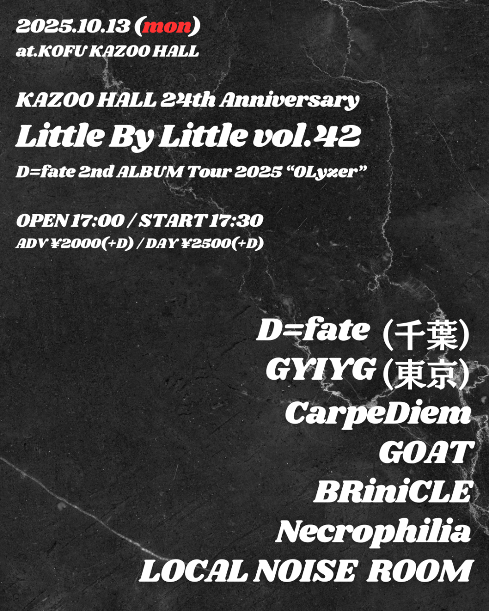 KAZOO HALL 24th AnniversaryLittle By Little vol.42 〜D=fate 2nd ALBUM Tour 2025 “0Lyzer”〜OPEN 17:00 / START 17:30 adv ¥2000(D別) / day ¥2500(D別) [出演] [チケット取扱い] |