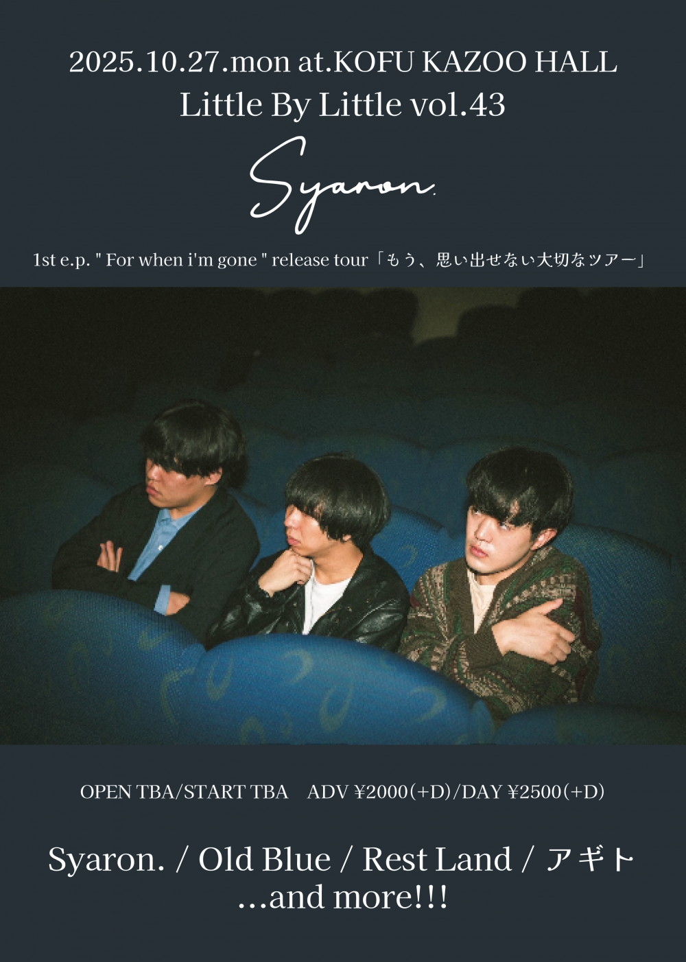 KAZOO HALL 24th AnniversaryLittle By Littlevol.43 〜Syaron. 1st e.p. " For when i'm gone " release tour「もう、思い出せない大切なツアー」〜OPEN 18:30 / START 19:00 adv ¥2000(D別) / day ¥2500(D別) [出演] [チケット取扱い] |