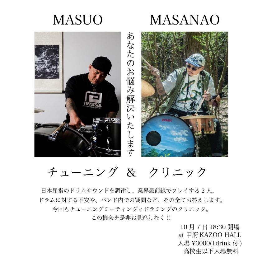 KAZOO HALL presents"MASUO" x "MASANAO" チューニング&クリニックOPEN 18:30 / START 18:30 adv ¥3000(1D別)/高校生以下入場無料 / day ¥3000(1D別)/高校生以下入場無料 [出演] [チケット取扱い] |