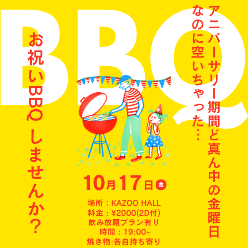 KAZOO HALL 24th Anniversaryカズーのアニバーサリーを祝うBBQOPEN 19:00 / START 19:00 adv ¥2000(2D付) / day ¥2000(2D付) [出演] |