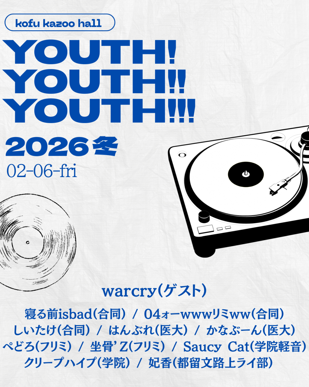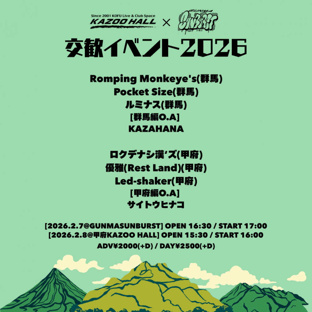 KAZOO HALL presentsyouth! youth!! youth!!! -2026 冬-OPEN 13:15 / START 13:45 adv ¥1000(D別) / day ¥1000(D別) [出演] [チケット取扱い] |