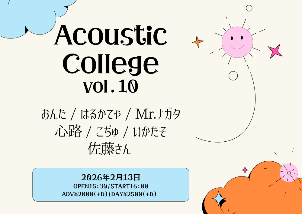 KAZOO HALL presentsAcoustic College vol.10OPEN 15:30 / START 16:00 adv ¥2000(D別) / day ¥2500(D別) |