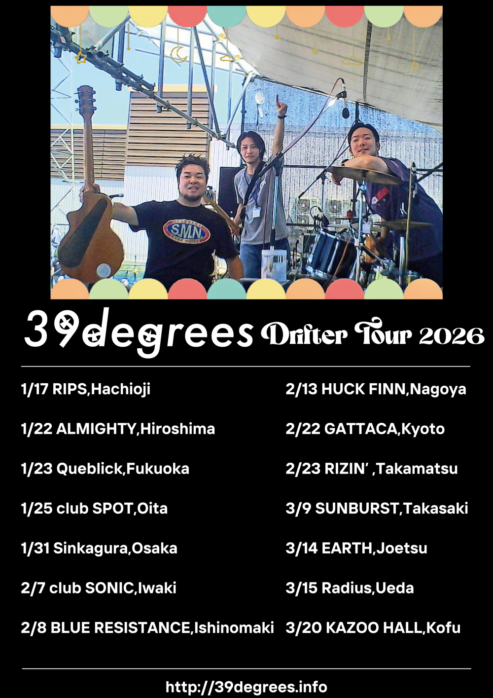 39degrees presents39degrees "Drifter TOUR 2026"OPEN 18:00 / START 18:30 adv ¥3000(D別) / day ¥3500(D別) [出演] [チケット取扱い] |