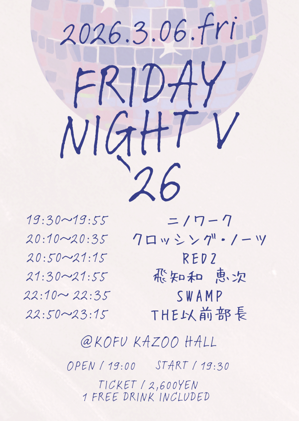 KAZOO HALL presentsFRIDAY NIGHT V '26OPEN 19:00 / START 19:30 adv ¥2600(D込) / day ¥2600(D込) [出演] [チケット取扱い] |
