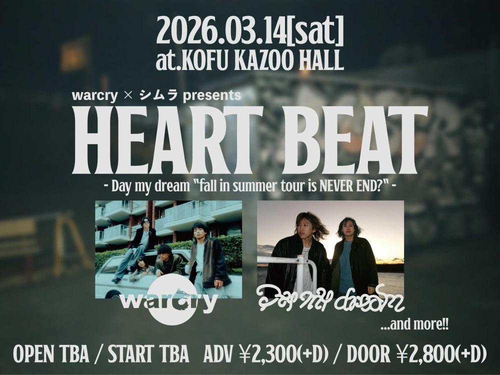 warcry × シムラ presentsHERAT BEAT - Day my dream "fall in summer tour is NEVER END?" -OPEN TBA / START TBA adv ¥2300(D別) / day ¥2800(D別) |