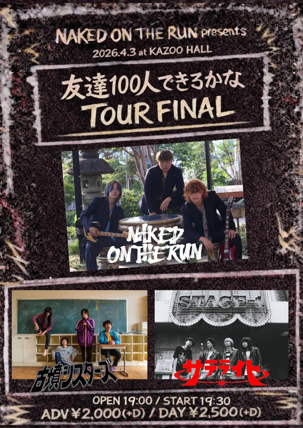 NAKED ON THE RUN presentsNAKED ON THE RUN “友達100人できるかなツアー” TOUR FINALOPEN 19:00 / START 19:30 adv ¥2000(D別) / day ¥2500(D別) [出演] [チケット取扱い] |