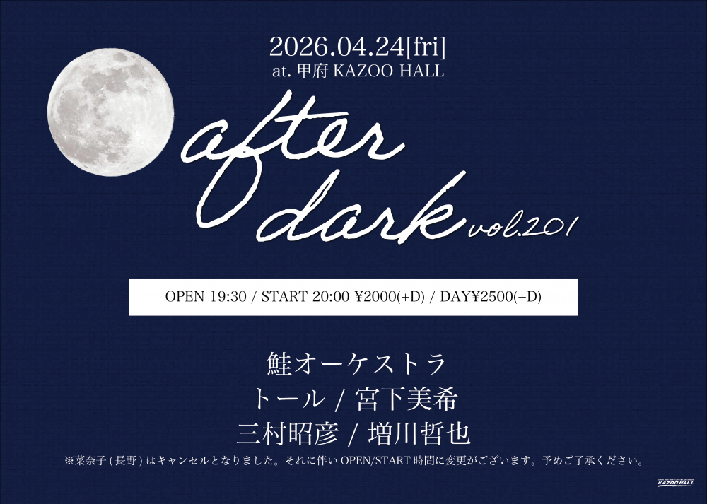KAZOO HALL presentsafter dark vol.199OPEN 19:00 / START 19:30 adv ¥2000(D別) / day ¥2500(D別) [出演] [チケット取扱い] |