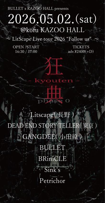 BULLET x KAZOO HALL presents狂典 phase.0OPEN 16:30 / START 17:00 adv ¥2400(D別) / day ¥2900(D別) [出演] [チケット取扱い] |