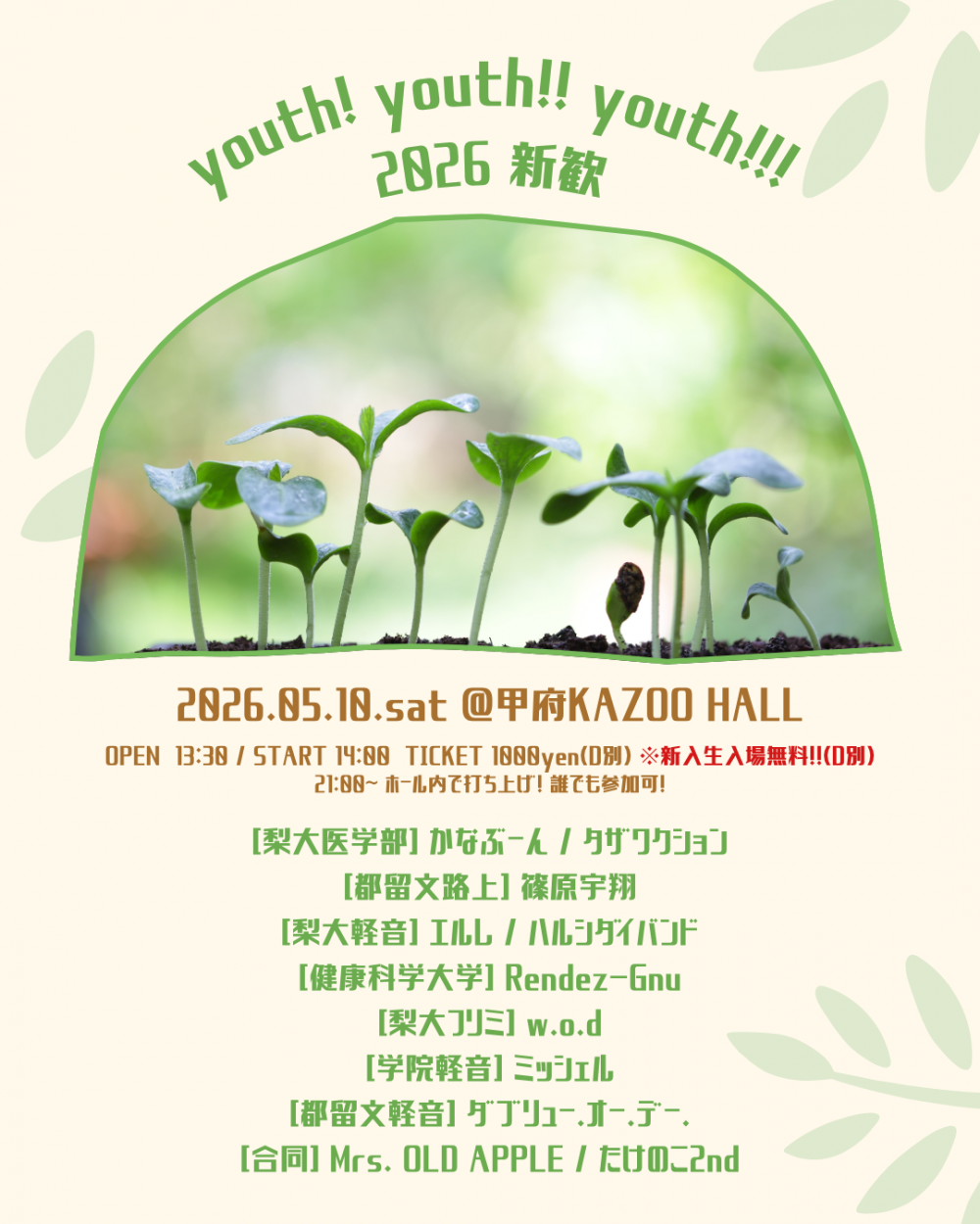 KAZOO HALL presentsyouth! youth!! youth!!! -2026 新歓-OPEN 13:30 / START 14:00 adv ¥1000(D別) / 新入生入場無料!!(D別) / day ¥1000(D別) [出演] [チケット取扱い] |