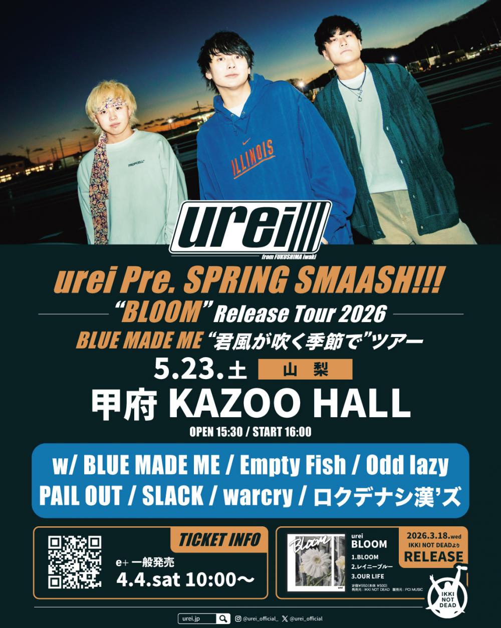urei presentsSPRING SMAASH!!! “BLOOM” Release Tour 2026 & BLUE MADE ME"君風が吹く季節で" ツアーOPEN 15:30 / START 16:00 adv ¥3000(D別) / day TBA [出演] [チケット取扱い] |
