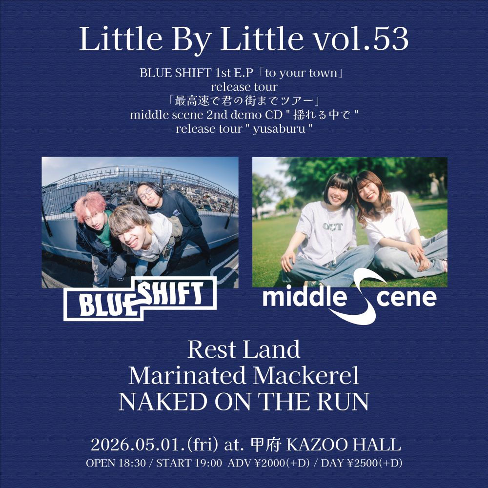 KAZOO HALL presentsLittle By Little vol.53 〜BLUE SHIFT 1st E.P「to your town」 release tour「最高速で君の街までツアー」〜&〜 middle scene 2nd demo CD " 揺れる中で " release tour " yusaburu "〜OPEN 18:30 / START 19:00 adv ¥2000(D別) / day ¥2500(D別) [出演] [チケット取扱い] |