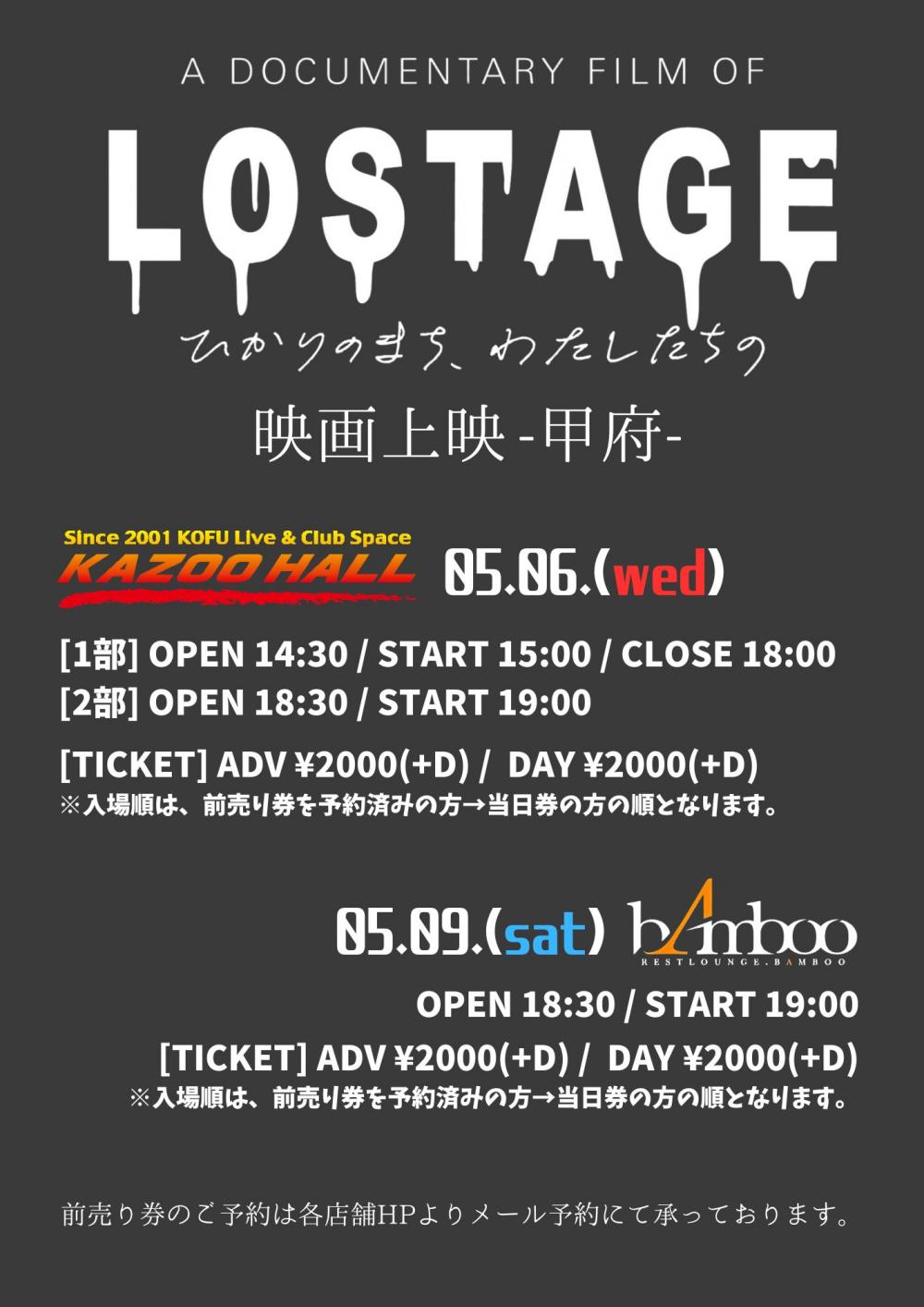 LOSTAGE presentsA DOCUMENTARY FILM OF LOSTAGE -ひかりのまち、わたしたちの- 映画上映OPEN [1部] 14:30 / [2部] 18:30 / START [1部] 15:00 / [2部] 18:30 adv ¥2000(D別) / day ¥2000(D別) [出演] [チケット取扱い] |