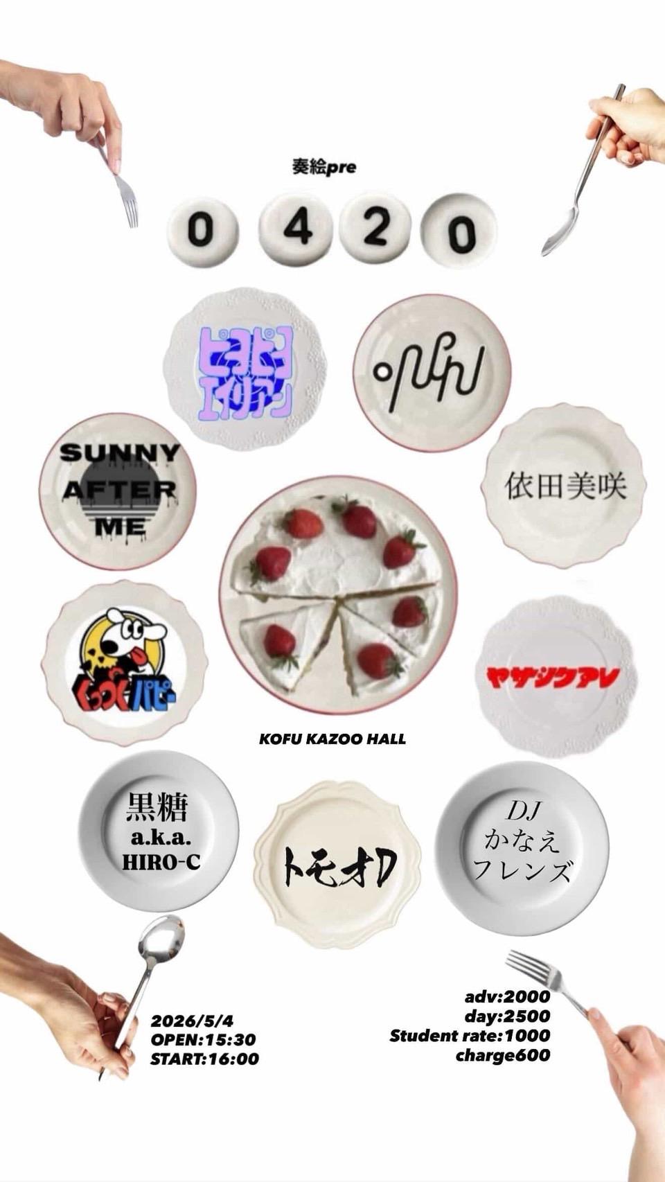 奏絵 presents0420OPEN 15:30 / START 16:00 adv ¥2000(D別)/学生¥1000(D別) / day ¥2500(D別) [出演] [チケット取扱い] |